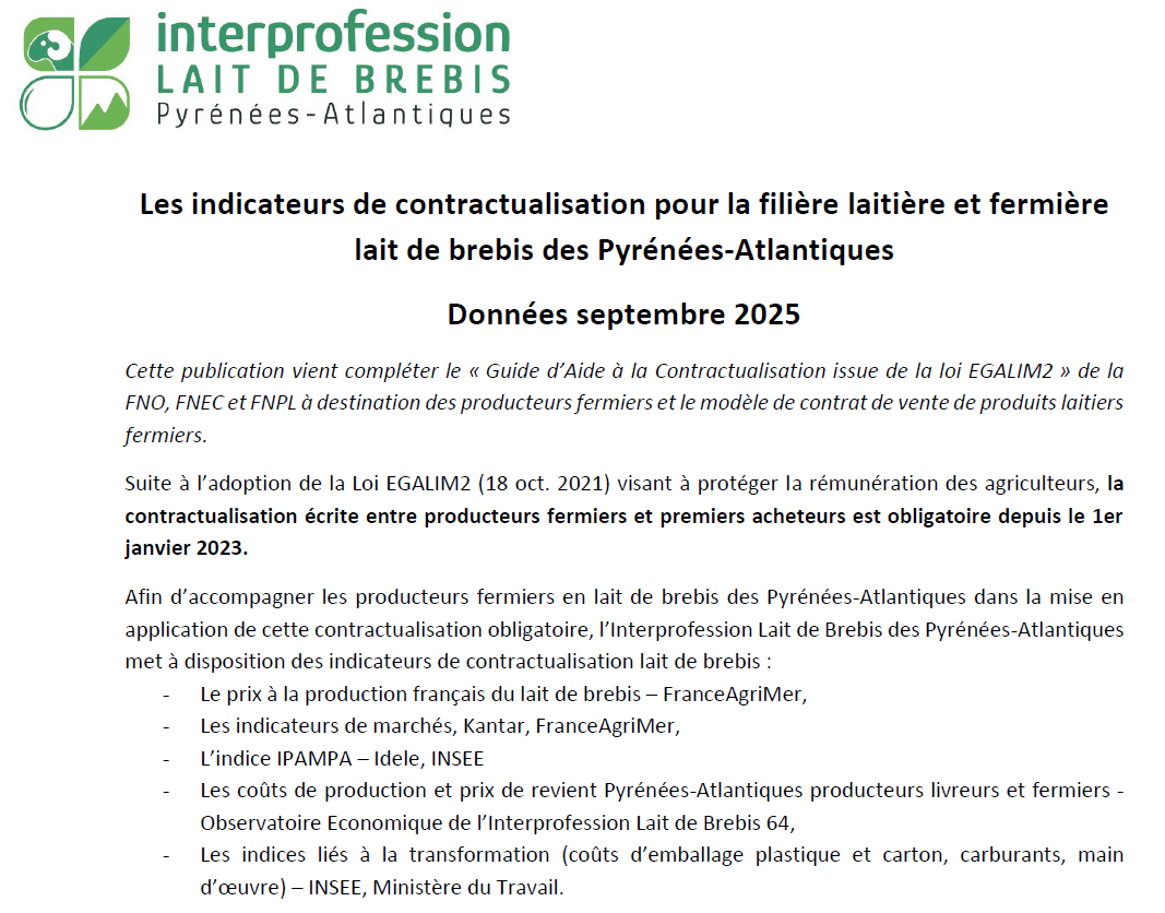 Indicateurs de contractualisation lait de brebis publiés par l’Interprofession en septembre 2025